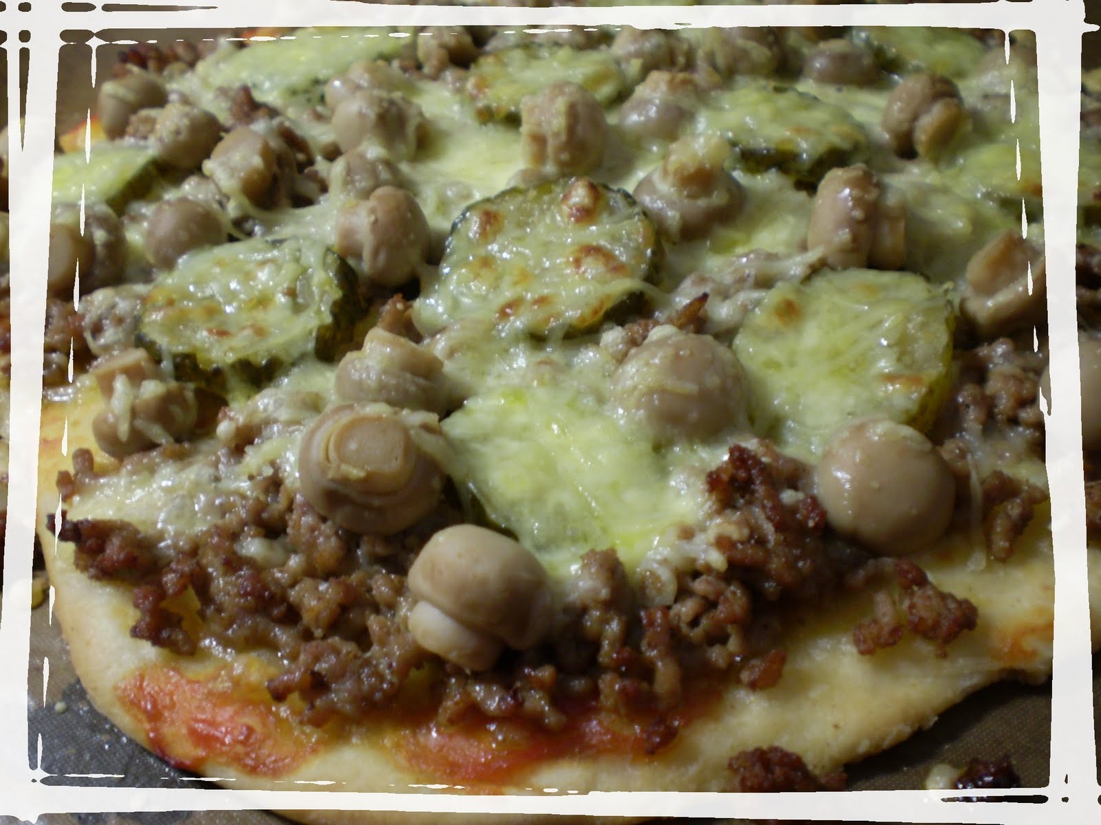 Jämäpohjan päällä ketsuppia, jauhelihaa, suolakurkkua ja purkkiherkkusieniä kera juustoraasteen. Ihanaa, ehdotonta teinivuosien krapulapitsaa !!